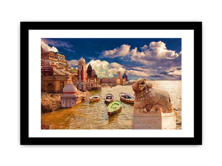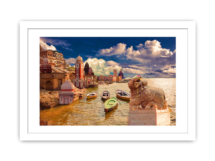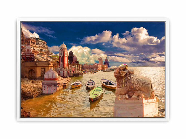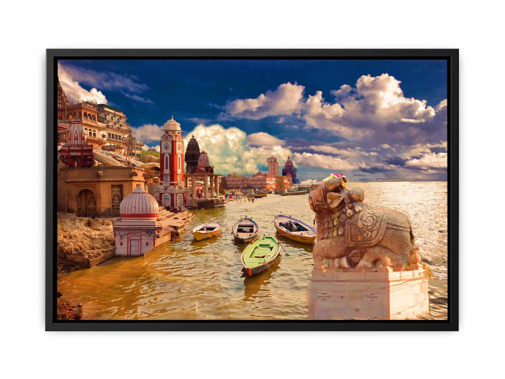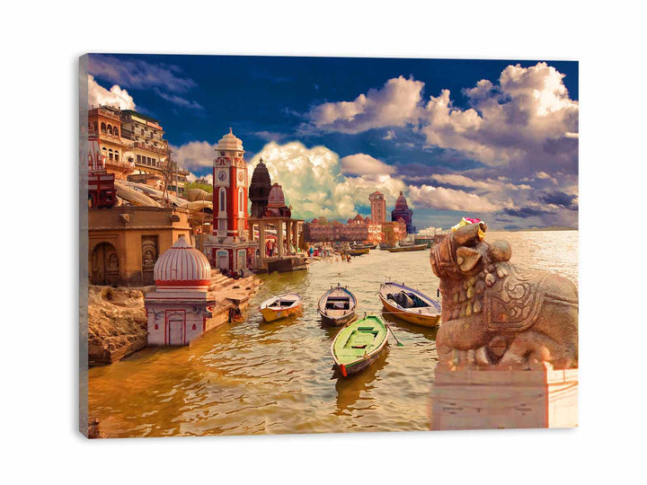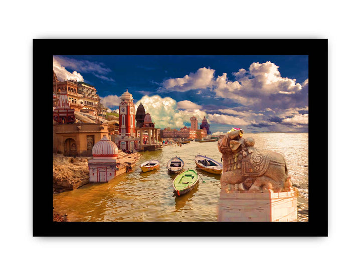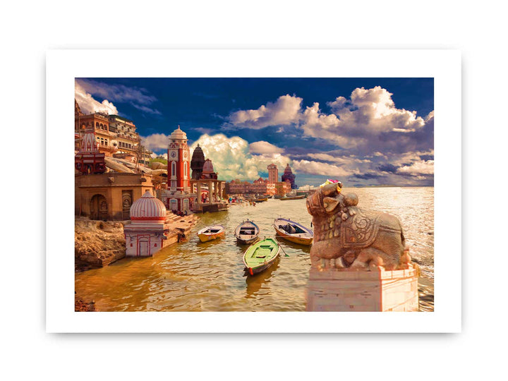 This impressionist painting places a sacred bull statue overlooking the Ganges river in Varanasi India. The rich tan and ochre colours are offset by the clear blue depiction of the river front. The buildings create busy effect and proximity makes the canvas full and surprising.